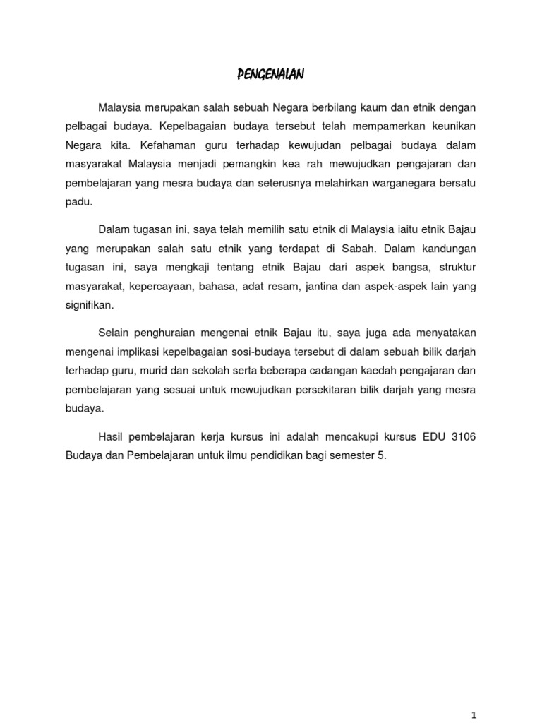 Etnik boleh didefinisikan sebagai hubungan antara kelompok manusia yang mengamalkan budaya yang hampir seragam termasuk adat resam pakaian bahasa dan kegiatan ekonomi. Berubah Budaya sentiasa mengalami perubahan. Perwujudan dari kebudayaan adalah barang atau benda-benda yang diciptakan oleh manusia atau individu sebagai makhluk yang berbudaya berupa perilaku dan benda-benda yang bersifat nyata misalya pola-pola perilaku tertentu bahasa tertentu peralatan hidup organisasi sosial kepercayaan dan religi seni dan lain-lain yang seluruhnya ditujukan untuk membantu manusia dalam melangsungkan.